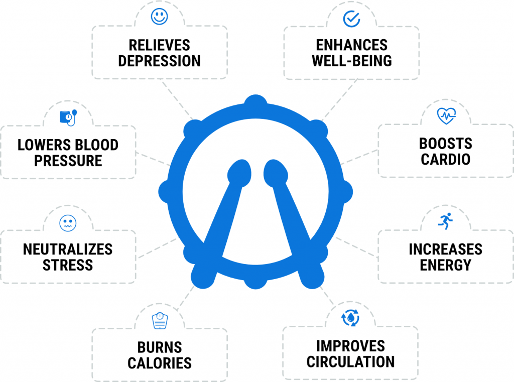The art of drumming is finally making its way into the health and wellness revolution. Over the last decade research involving the neurobiological underpinnings of drumming has seen tremendous growth. Unfortunately, the perception of the art form is still one dimensional. Magazine pages and Instagram feeds perpetuate the portrayal of drumming being only about extreme speed, tricks, and jaw-dropping abilities. Yes, skillful prowess is a significant part of drumming, but it’s not the whole picture. When you take a step back, you’ll be able to notice the remarkable number of positive effects drumming has on your health.